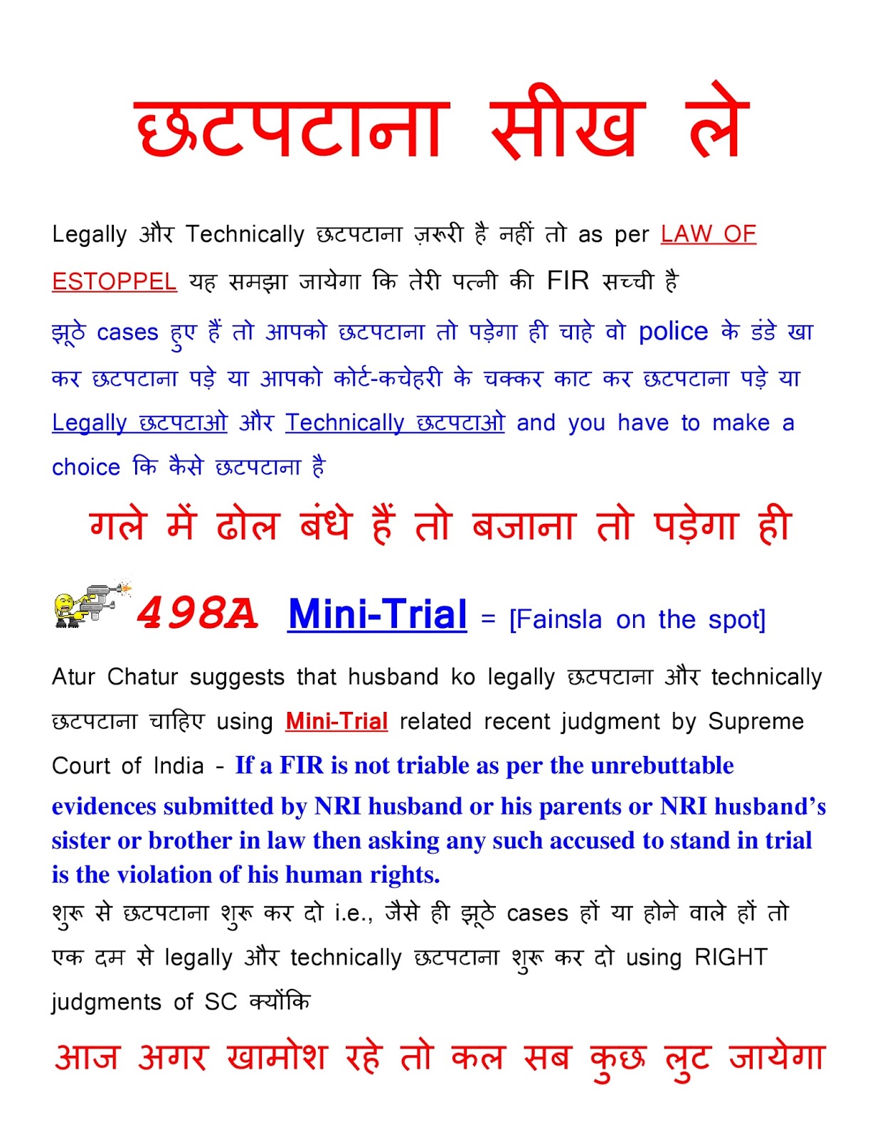 Further, Mini-Trial is the right of an accused as per Supreme Court of India's recent judgment as per which when the matter is not triable as per the unrebuttable evidences of the accused then asking an NRI husband or an accused to stand in a trial is the violation of the human rights of nri and these human rights violation of a non resident indian husband needs to be invoked in the right manner so that this SC Judgment helps men victims of false cases win in his fight against false cases or false accusations.